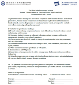 – Schulleitende unterzeichneten ein Verschwisterungsabkommen zwischen Kaufmännischer Schule Lörrach und der National Tainan Commercial Vocational Senior High School