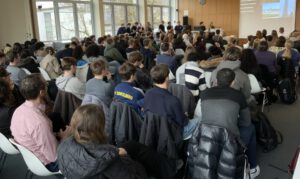Foto (Fotograf: Stefan Dede): Auf breites Interesse ist der Bericht der Teilnehmenden am Taiwan-Austausch gestoßen. Die Aula der KSLö war voll besetzt.